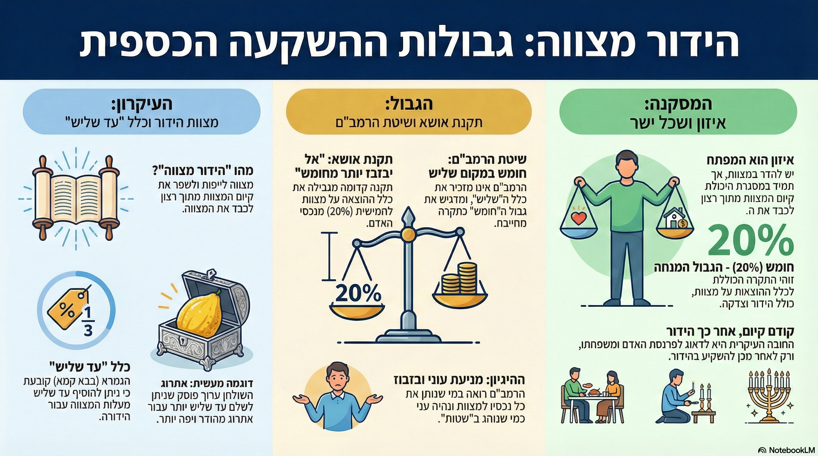 נושא מרכזי: קיימת מצווה להדר במצוות, אך ישנה מחלוקת ודיון סביב השאלה האם קיים שיעור מחייב לגובה ההשקעה בהידור זה, ובפרט האם קיים שיעור של עד שליש מעלות המצווה הבסיסית. כמו כן, נדון הגבול העליון של ההוצאה על מצוות בכלל, העומד על חומש מנכסי האדם.
