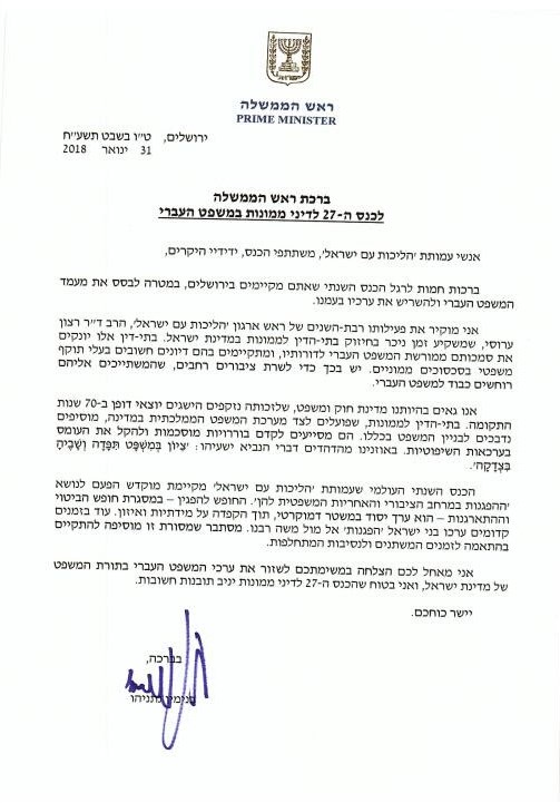 ברכת ראש הממשלה בנימין נתניהו לכנס ה-27 לדיני ממונות במשפט העברי