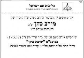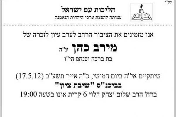 הציבור הרחב מוזמן לערב עיון לזכרה של מירב כהן ז"ל