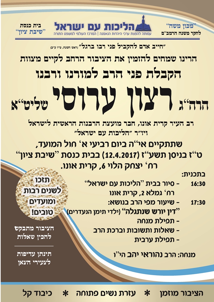הקבלת פני רבו ברגל בבית הכנסת "שיבת ציון" קרית אונו