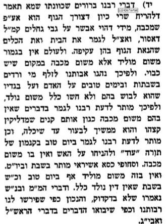 כלומר מדברי רש"י משמע שיש איסור של מוליד דבר חדש בשבת מדרבנן משום שזה דומה למלאכה. ולכן לכאורה יש איסור חשמל בשבת מדין מוליד שבאמצעות הזרמת החשמל, האדם מוליד דבר חדש בכלי, אם למאור ואם לפעולה אחרת אף שאין הבערה של גוף מתכת.